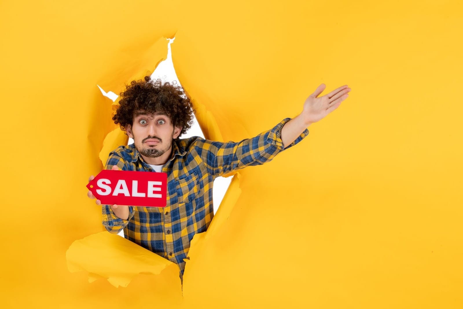 <a href="https://www.freepik.com/free-photo/front-view-young-male-holding-red-sale-writing-yellow-ripped-background_15737489.htm">Image by KamranAydinov on Freepik</a>