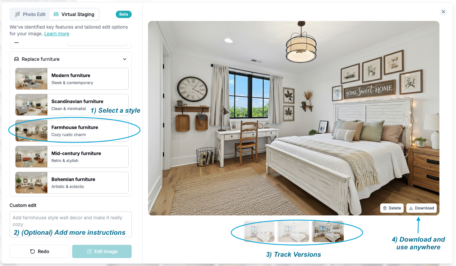 - For cluttered rooms, clean first with Photo Edits, then stage.