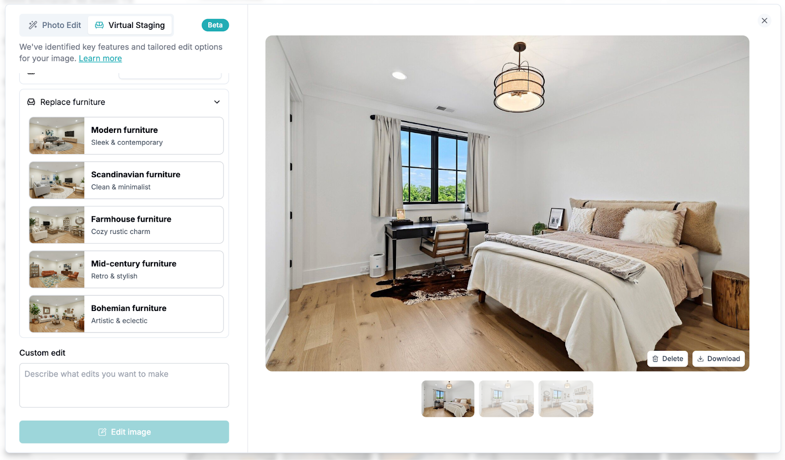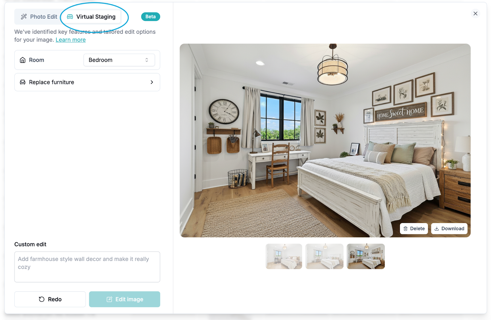 Virtual Staging is built on top of AI Photo Edits and works in a similar way, so it’s encouraged to read the guide on Photo Edits as a starting point. It sits next to Photo Edits in the same modal window, simply just toggle the Virtual Staging tab when you need to furnish or refurnish a room.