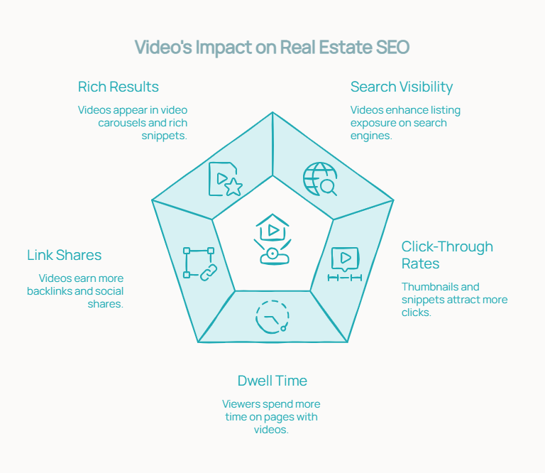 Video improves search engine optimization for real estate by increasing dwell time, lowering bounce rates, and boosting engagement.