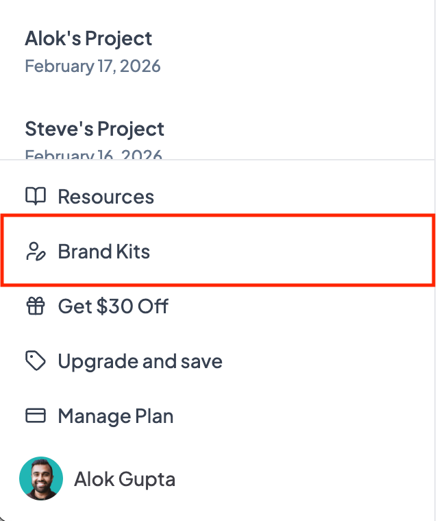 Head to the sidebar in the main menu and open the Brand Kits section. This is your central hub for managing all of your brand profiles.