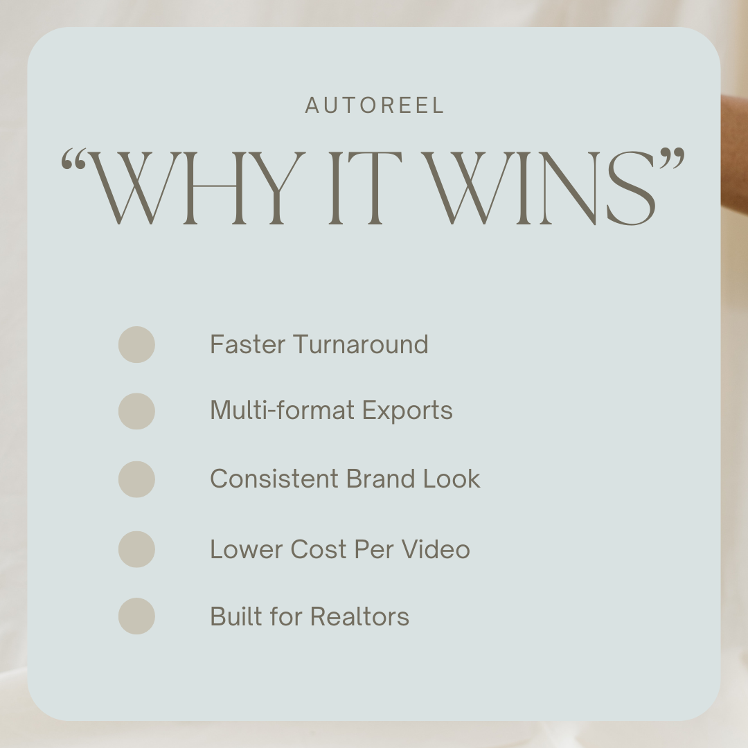 AutoReel is built for the job you actually have:produce consistent, listing-ready, social-ready content at scale—without a production bottleneck.