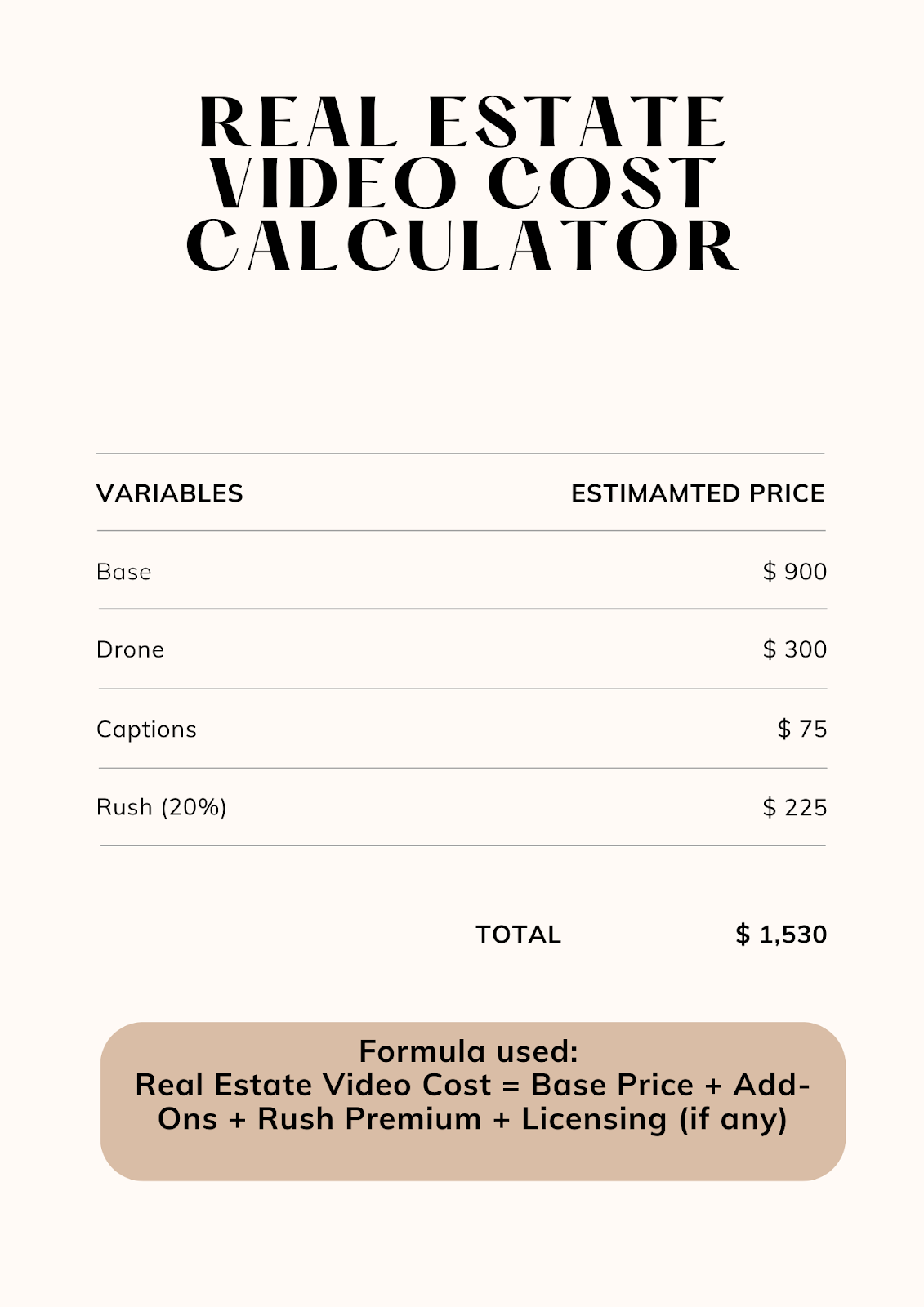 Real Estate Video Cost = Base Price + Add-Ons + Rush Premium + Licensing (if any)